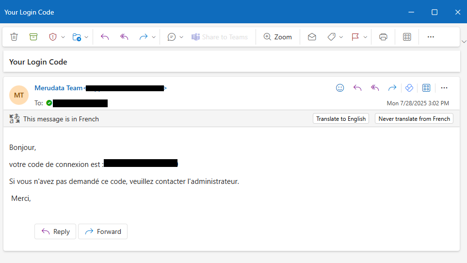 1. Once selected, the system will send an email to retrieve the login code in the chosen language.