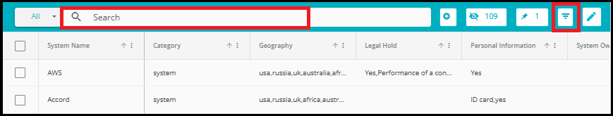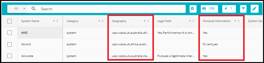 • Now the configuration will filter the results further and only provide the systems with Australia as the value in the geography field and which have the value Yes in the Personal Information field. In a similar way, the systems can be filtered to bring the desired results.
