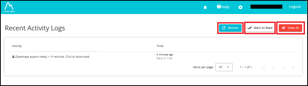 The Activity Logs page provides three important control buttons---Refresh, Mark All Read, and Clear All---to help you manage your notifications efficiently.