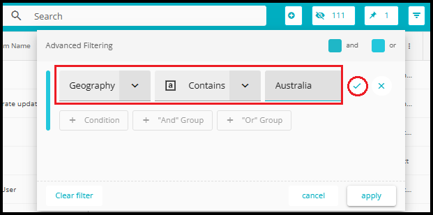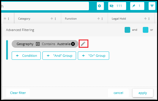 • In the Advanced Filtering interface, if you want to change or modify an existing condition (e.g., Geography Contains Australia), you can do so by clicking the edit symbol next to the condition. This allows you to update the column, filter, or value as needed.