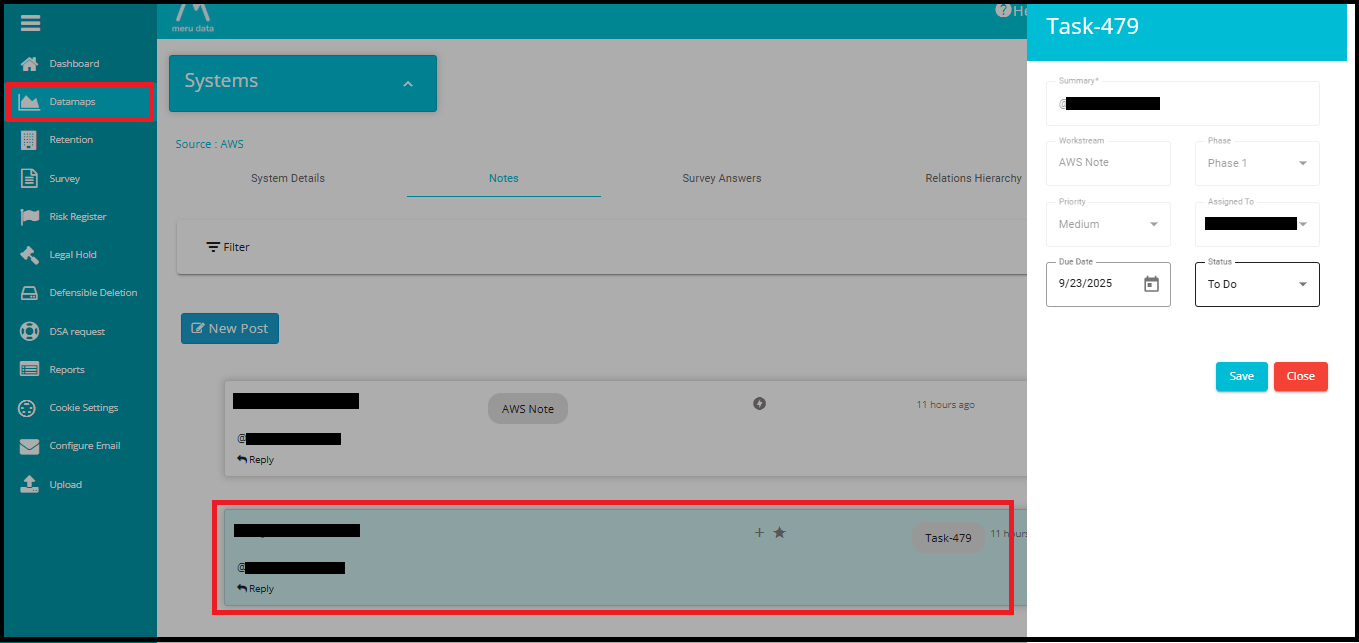 Notes can be created from Datamaps, Survey, and Risk Register modules.