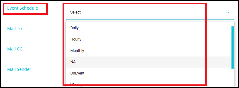 • Event Schedule: This field allows you to define how frequently the email will be sent. You can choose from predefined options such as Daily, Hourly, Monthly, Weekly, or NA. Select NA (No Action) if you want to keep the Event Schedule blank or invalid.