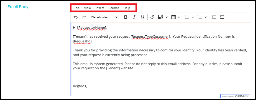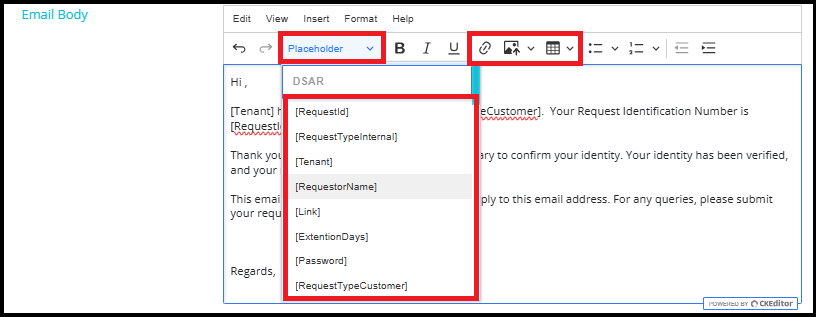 Note: Placeholders specific to a module will only work for that particular module. For example, if placeholders from the DSR module are added to an email template and that template is used for the Survey module, some placeholders may not function as expected. Always ensure that the placeholders in your template match the module where the template will be used.