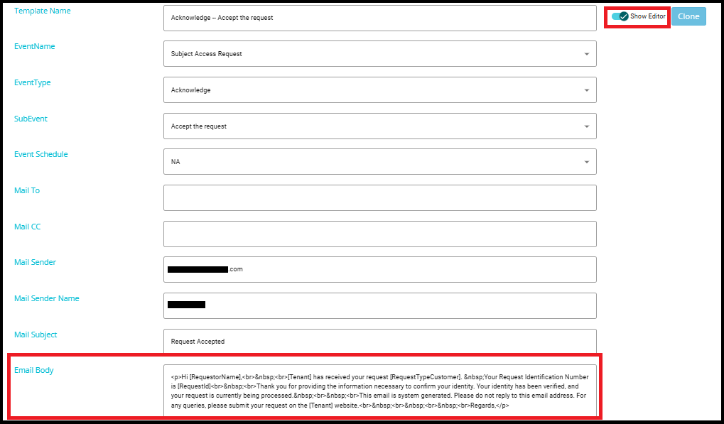 1. Clone: The Clone option allows you to create an exact copy of the selected email template. When you click Clone, the system duplicates all the fields---including Event Name, Event Type, SubEvent, Mail Sender, Mail Subject, Email Body, and other configurations---and creates a new editable template based on the original.