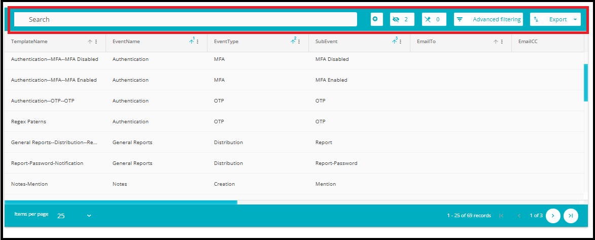 1. The Email Configuration Page will display already existing email templates, as well as the option to search, create new templates, filter templates, and export.