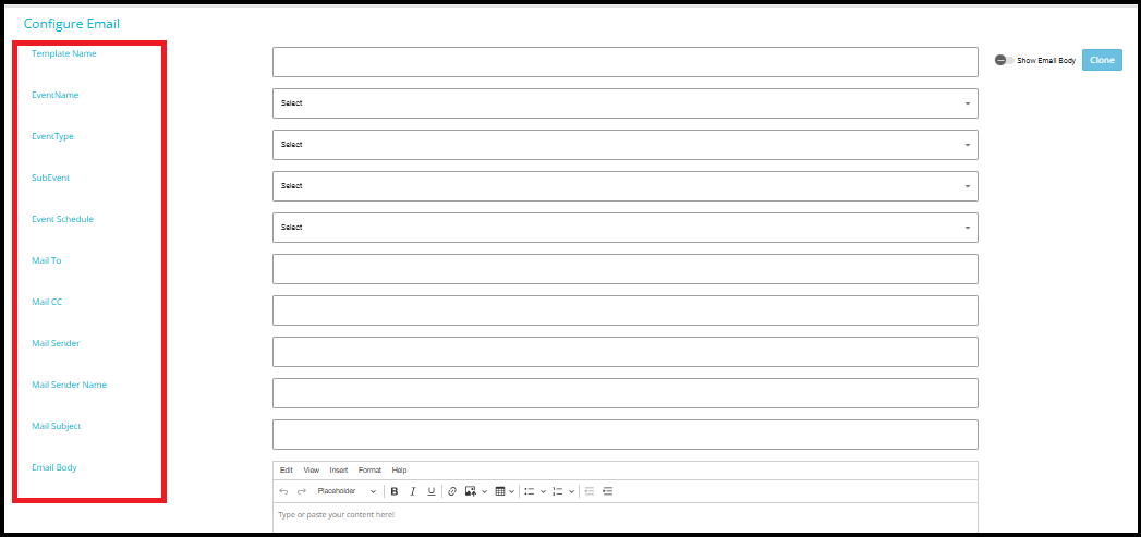 • Email Body: This is the main content area of the email. You can compose the body using plain text or HTML, depending on the formatting requirements. The Email Body may include placeholders, dynamic fields, or structured layouts to personalize communication. Ensure that the content is clear, accurate, and relevant to the selected event and workflow.