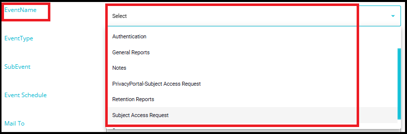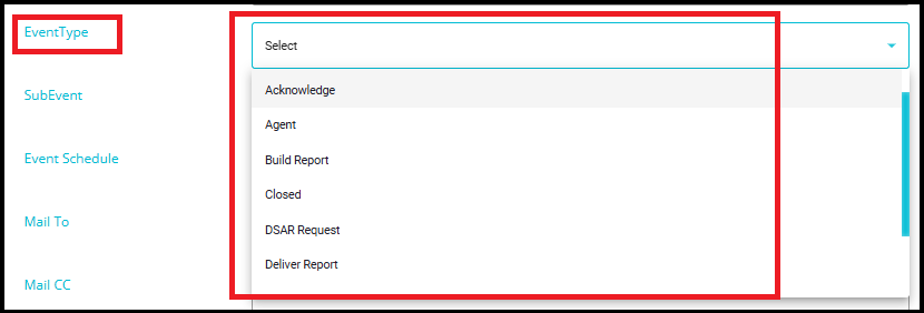 • Event Type: This represents the subcategory of the selected Event Name. After choosing an Event Name, you must select the appropriate Event Type from a predefined dropdown list. For example, if you choose "Subject Access Request" as the Event Name, the Event Type dropdown may include options such as Acknowledge, Agent, Build Report, Closed, etc.