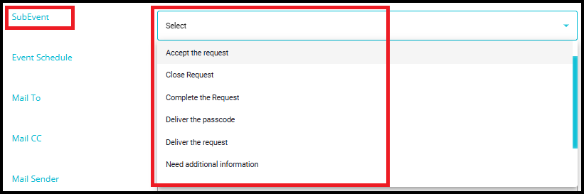 For example, if the Event Name is "Subject Access Request" and the Event Type is "Acknowledge", the Sub Event dropdown will display options such as Accept the request, Close Request, Complete the request, etc.