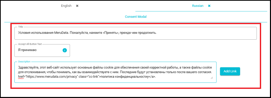 Note: The system does not automatically translate content. If you select Russian, you must use a translator and input the translated text yourself.