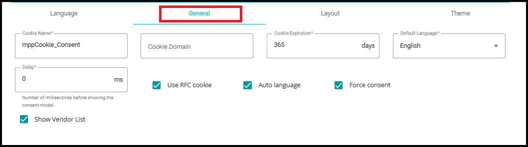 Note: The settings marked with (NA)—such as Cookie Name, Cookie Domain, Cookie Expiration, Delay, Use RFC Cookie, and Show Vendor List—are not applicable for the Information Banner. These features are relevant only to cookie‑based consent banners and do not apply to the Forced Consent Information Banner, which does not rely on cookies for storing consent.