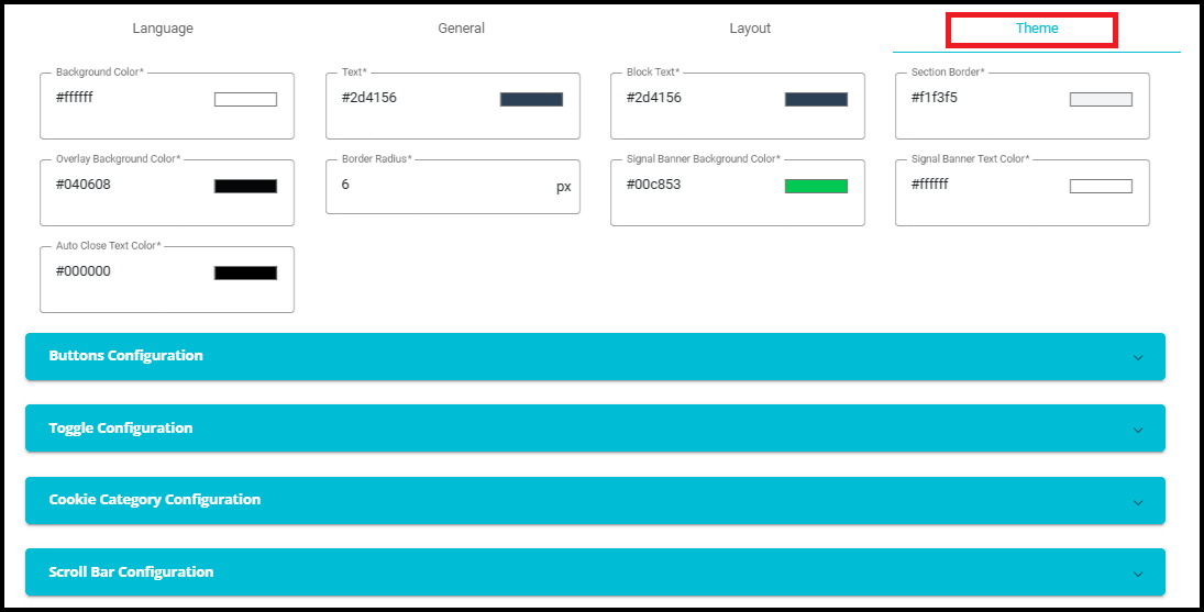 Note: For the Information Banner, only Theme and Button Configurations are applicable. The remaining options—Toggle Configuration, Cookie Category Configuration, and Scroll Bar Configuration—do not apply to the Information Banner.