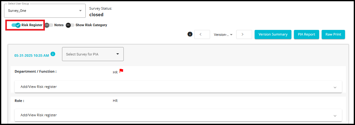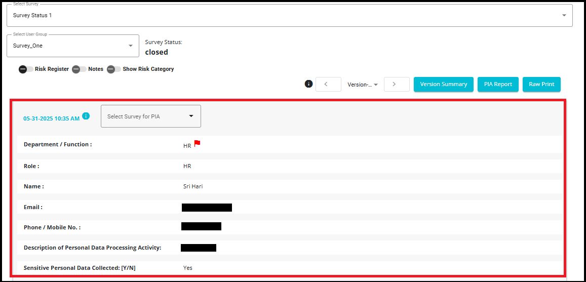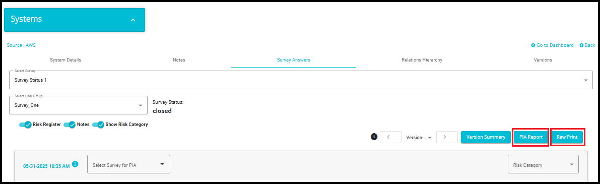 1. The Survey Answers can be printed if required by clicking the Raw Print button or can be generated as a PIA Report upon clicking the dedicated button.